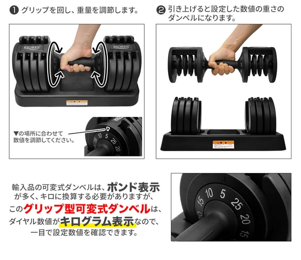 品名:RIORES グリップ型 可変式ダンベル 25kg