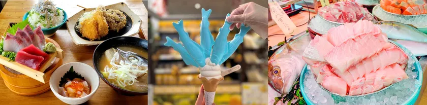 (左)カンパチ堪能定食 (中央)おさかな刺さりすぎソフト (右)カンパチ食べ放題