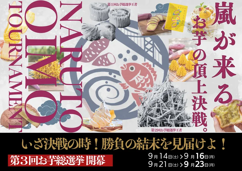 徳島・鳴門の魅力を発信する体験型食のテーマパーク「道の駅くるくる なると」(所在地:徳島県鳴門市)は、2024年9月14日(土)~9月16日(月)/9月21日(土)~9月23日(月)の計6日間でお芋総選挙を開催いたします。皆さまの投票によって2024年の人気ナンバー1お芋メニューを決める「第3回お芋総選挙 嵐が来る お芋の頂上決戦。」さつまいもが旬を迎える今、真の人気お芋メニュー頂上決戦が幕を開けます。