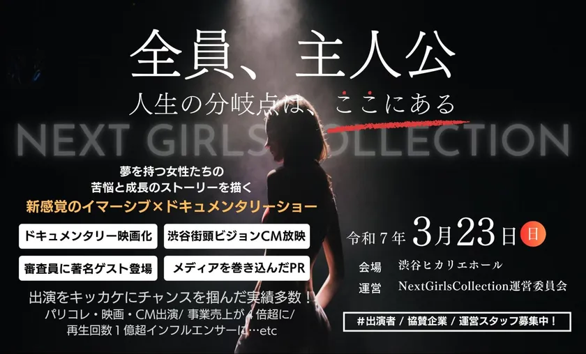 Next Girls Collection運営委員会の事務局を務めるPOT合同会社(本社:東京都中央区/CEO:増山哲也)及び主催プロデューサーのMass(増山哲也)・熊谷将臣・渡辺寛之は、ドキュメンタリー番組とランウェイで紡ぐ「関わる全員が主人公になれる」新感覚のイマーシブドキュメンタリーショー『Next Girls 5th Collection』を2025年3月に開催することを発表いたします。