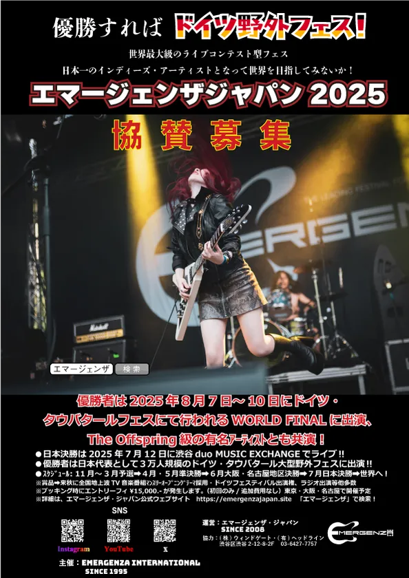 株式会社ウィンドゲートが、日本のミュージシャンが海外で活躍できる架け橋を作る為に、優勝すればドイツ野外フェスに出演できる世界最大級のライブ・コンテスト「エマージェンザ・ジャパン2025シーズン」として開催いたします。2024シーズンでは高知の若いロックバンド“THE・ステレオギャング”が世界3位となりました。事前音源審査・チケットノルマ・機材費などはなく、予選・準決勝はオーディエンスによる会場投票及びネット投票(東京大会及び日本決勝のみ)でのみ勝ち上がります。過去の出演アーティストから多数のメジャーアーティストが輩出されています。エマージェンザは世界で32年、日本で16年、コロナ禍の時期を除き、連続での開催実績があります。