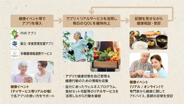 本実証では、2024年10月~12月の間、60歳以上のシニア層を対象とし、日々の健康データおよび介護現場における担当者間の情報連携等のPHR(健康・医療・介護に関する患者の情報)データについて、各種アプリ※2を通じて集めます。集めたデータをもとに、健康状態に応じた料理レシピの提案や健康イベント、デイサービス、食品宅配、運動支援サービス等のリアルサービスを併せて提供し、シニアの健康行動の継続と消費促進効果、それに伴う事業者のサービスの向上や経済効果の創出力を検証・評価します。