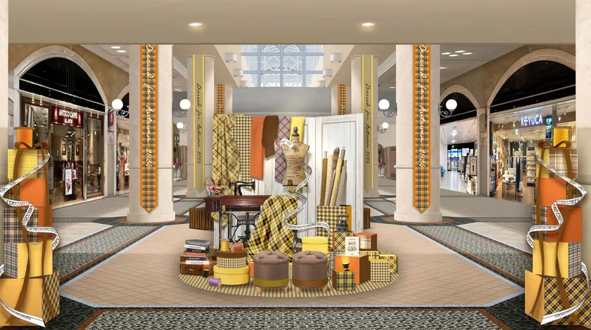 今秋のテーマは「Dressed for Autumn -秋をまとおう-」ということで、身にまとう洋服や、旬の味覚を楽しむことで秋の訪れを感じていただきたいというメッセージを込めています。秋らしいカラーやチェック柄を用いた秋の洋服を仕立てていく様子を表現しています。
