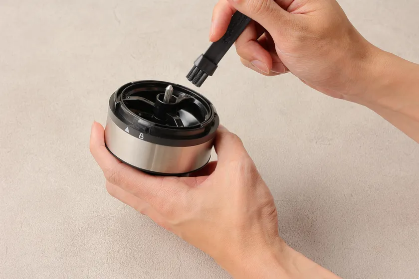 4. ミルは豆が無くなったタイミングで取り外し、付属のクリーニングブラシでお手入れが可能。