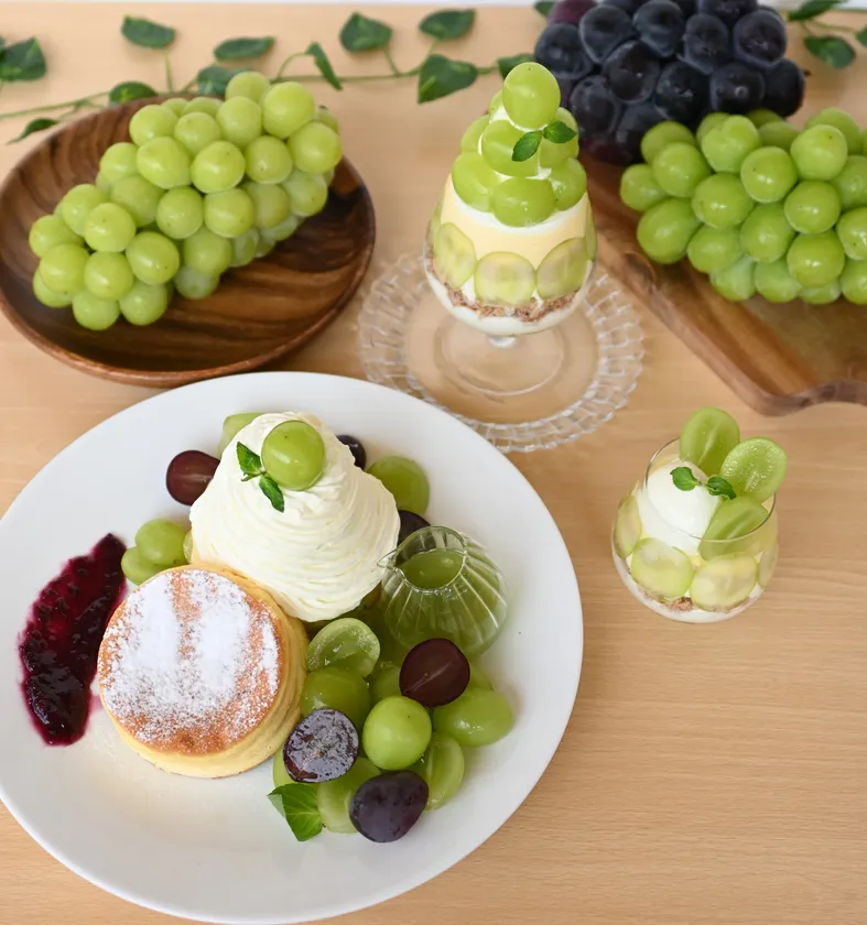 (左)贅沢シャインマスカットパンケーキ/(右奥)シャインマスカットタワーパフェ/(右)ミニシャインマスカットパフェ