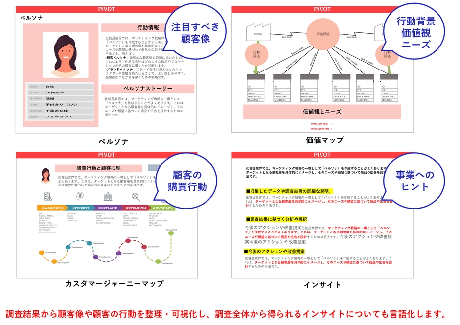 ペルソナシート、価値マップ、カスタマージャーニーマップなど、多角的な視点から顧客理解を深めるための詳細なレポートを提供します。