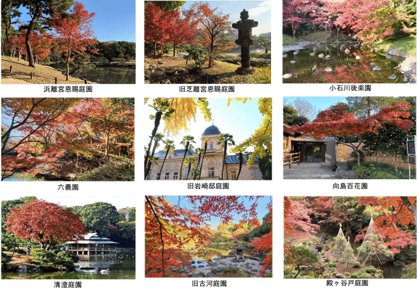浜離宮恩賜庭園(中央区)、旧芝離宮恩賜庭園(港区)、小石川後楽園(文京区)、六義園(文京区)、旧岩崎邸庭園(台東区)、向島百花園(墨田区)、清澄庭園(江東区)、旧古河庭園(北区)、殿ヶ谷戸庭園(国分寺市)