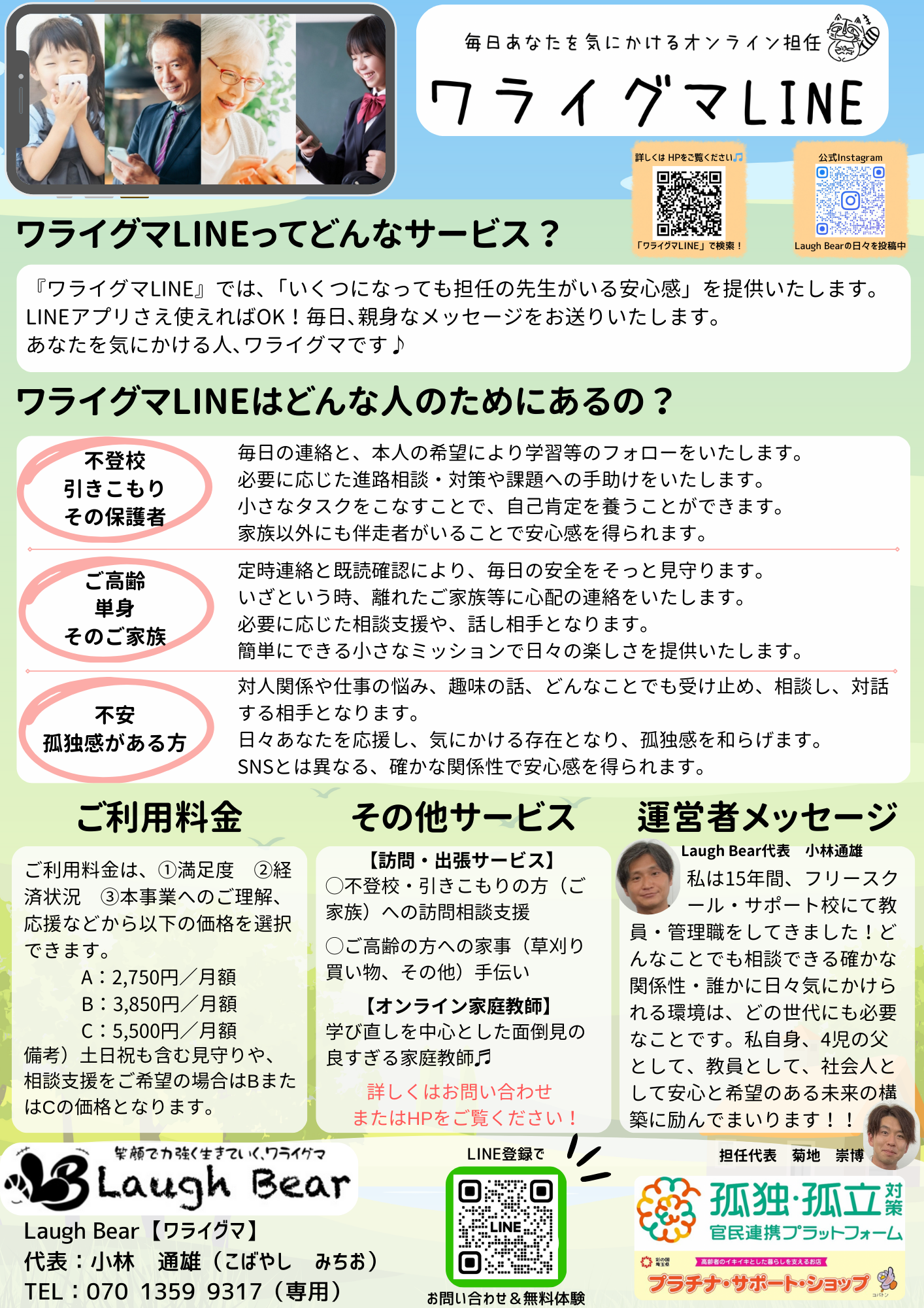 Laugh Bear(ラフベアー、所在地:千葉県野田市、代表者:小林 通雄)は、孤独・孤立対策推進法が施行されて半年、社会的孤独や孤立死が増加する現代社会で、“全ての人に担任を”を掲げるLINEを使った新しい見守りサービス『ワライグマLINE』の提供を開始し、本格始動いたします。
