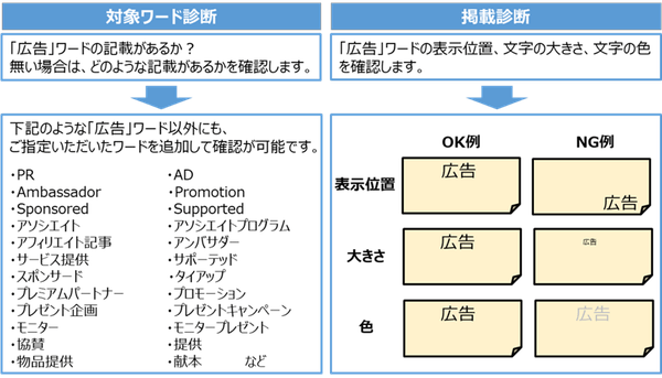「ステマ診断」は、広告審査専門スタッフが商品名などでクローリングを行い、インフルエンサーの投稿内容等をチェックするサービスです。広告であると判別できるワードが記載されているかを確認する「対象ワード審査」に加えて、その対象ワードの位置/大きさ/色などが適当であるかの「掲載審査」を実施することで、ステルスマーケティングに該当する恐れのある投稿を特定し規制開始に向けた迅速な対応を支援いたします。