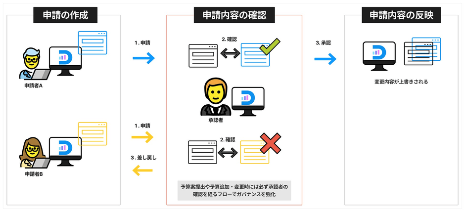 申請・承認機能とは、予算案提出や追加予算・予算額変更等の申請から承認までを「DIGGLE」上で行える機能です。承認者から申請者に対する予算・見込の記入依頼を行うことも可能です。