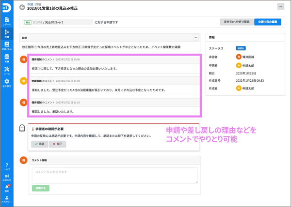 申請・承認機能の提供により、事業部側の担当者は予算案や追加予算・変更等の記入時に、必ず経営管理担当者に対する申請を行うことを必要とする運用が可能になります。申請がされると、承認者は「承認」か「差し戻し」(申請者に修正を依頼する)、「却下」(申請は却下されアーカイブされる)の判断を行うことができ、「承認」が行われると申請内容が反映されます。適切な運用フローを決めることで、企業ごとに適した内部統制機能の構築と、見込の正確な管理が可能になります。