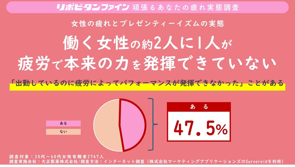 働く女性(20代~60代女性有職者2747人)に「出勤しているのに疲労によってパフォーマンスが発揮できなかったことがありますか?」と尋ねたところ、「ある」と回答された方が47.5%となりました。働く女性の約2人に1人が、“疲労”による出勤時の生産性低下を経験している実態がわかりました。