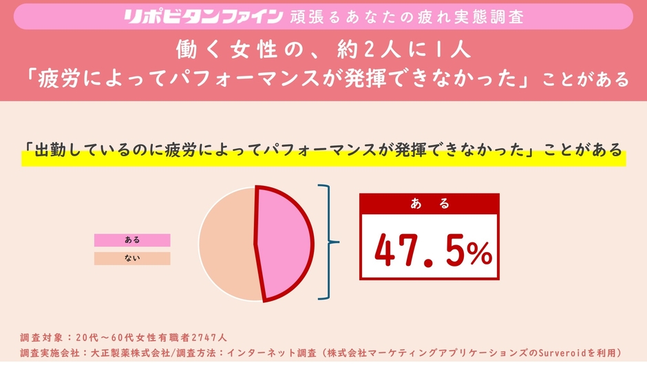 1. 働く女性の、約2人に1人(47.5%)が「疲労によってパフォーマンスが発揮できなかった」ことがある!