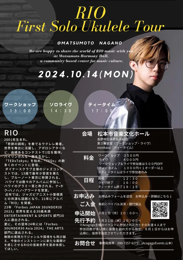 信州イベント企画事務局は、「Forbes JAPAN 30UNDER30 2023」世界を変える30歳未満 に選出されたウクレレプレーヤーRIOが、2024年10月14日(月・祝)に、初ワークショップ&ソロライヴを長野県松本市で開催することをお知らせします。若さ溢れる表現力と超絶技巧の演奏をお楽しみください。