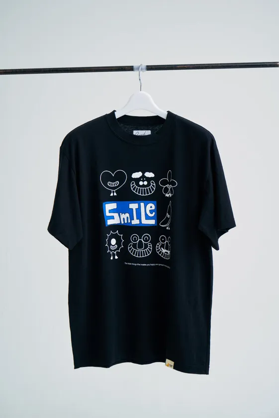 笑った時の口元に注目し、食事をしている瞬間や太陽を浴びた時、愛情を感じた時など人が幸せを感じるさまざまな瞬間をイラストで表現。Tシャツを着てくださる皆さんと笑顔の瞬間を一緒にという想いが込められています。