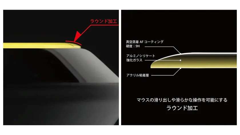 ・アルミノシリケート強化ガラスとエッジのラウンド加工によるスムーズな滑走