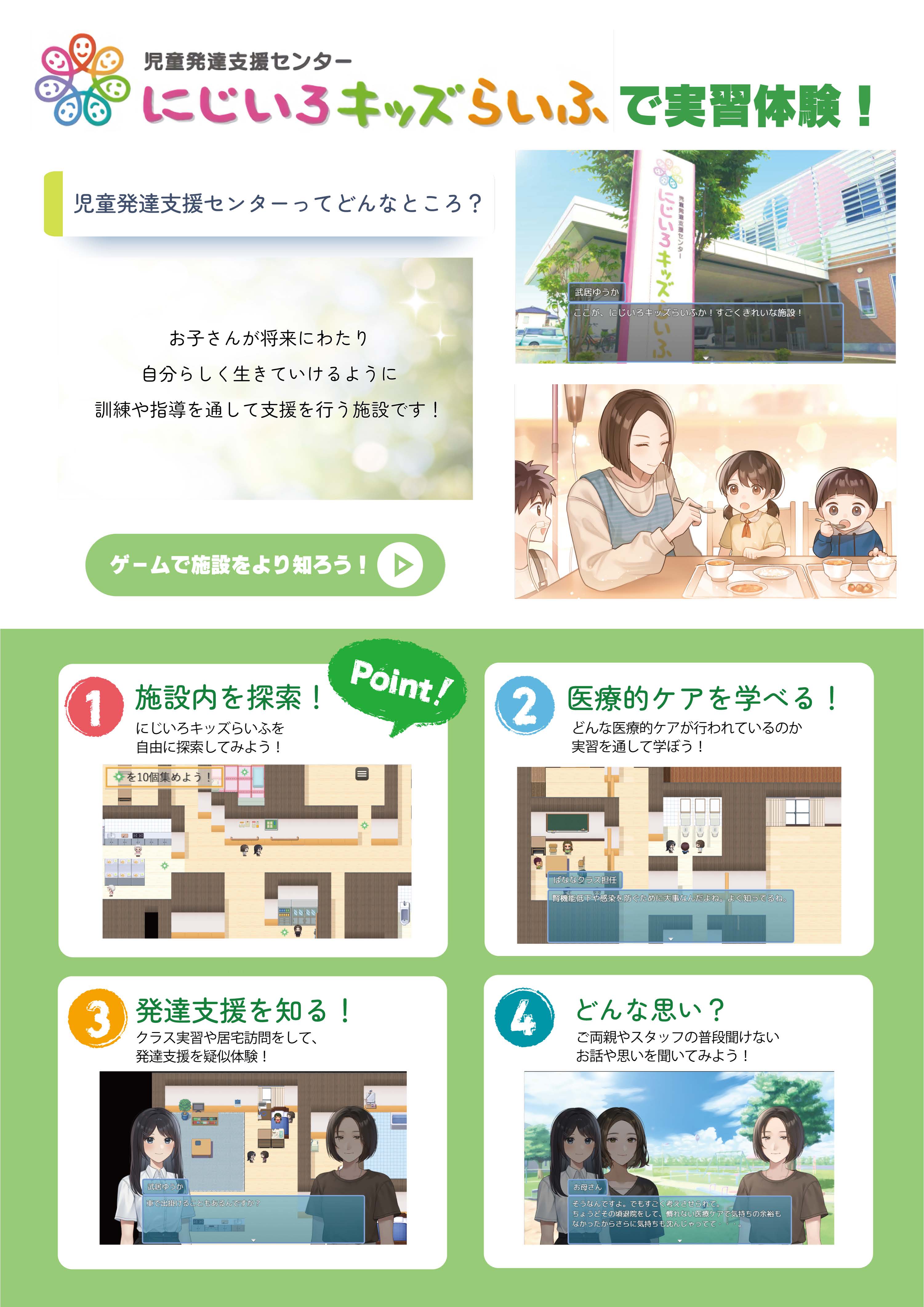 シリアスゲームとは社会問題の解決促進を目的としたゲームです。三代澤助教は医学生らとともにこれまで妊産婦支援・新生児医療体験・感染対策を題材としたシリアスゲームをリリースしてきました。同医師は新生児医療を専門とする小児科医ですが、医療的ケアを必要とするお子様の支援に携わっており、一般の方が目にする機会の少ない児童発達支援施設での療育活動を多くの方に知ってもらいたいという思いで今作を制作しました。ゲームの舞台は長野市にある児童発達支援センター「にじいろキッズらいふ」です。ロールプレイング形式で施設内を自由に探索でき、施設の職員や子どもたち、保護者と関わりながら、療育や医療的ケア、在宅医療などを学ぶことができます。