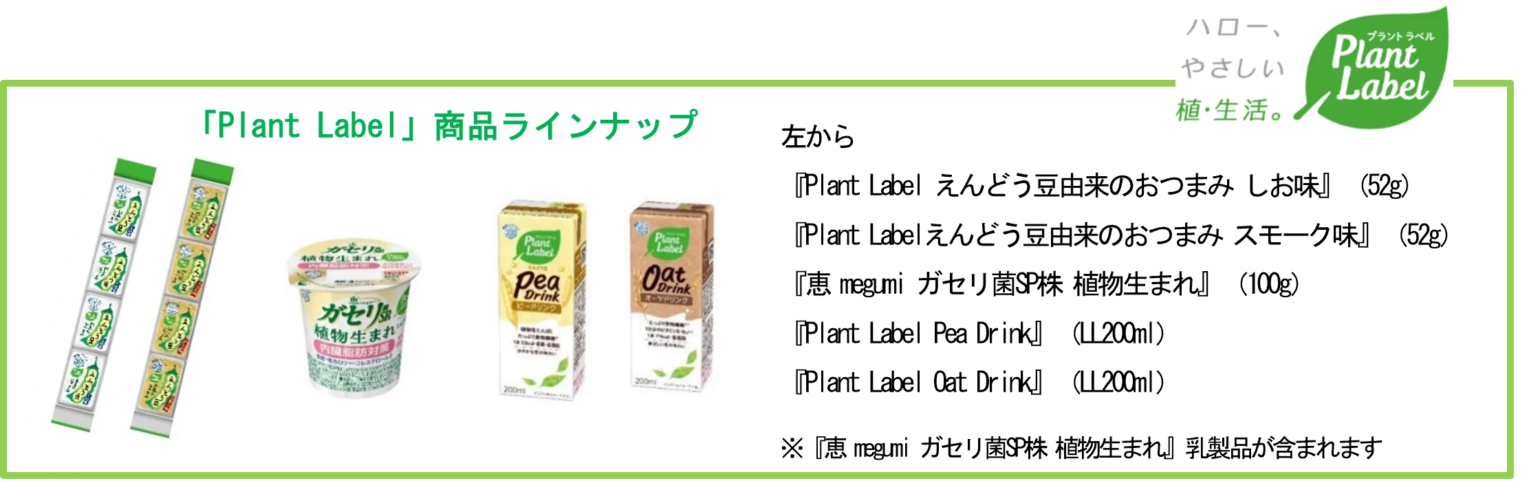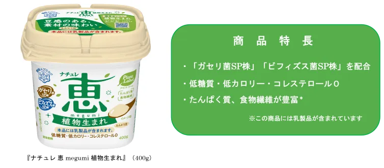 『ナチュレ 恵 megumi 植物生まれ』は、植物性素材の一つとして世界的に注目されている「えんどう豆」由来の原料を使用しており、低糖質・低カロリー・コレステロール0の仕立てで、たんぱく質と食物繊維も豊富※です。『ナチュレ 恵 megumi』シリーズにも使用している当社独自の乳酸菌である「ガセリ菌SP株」と「ビフィズス菌SP株」を配合しています。