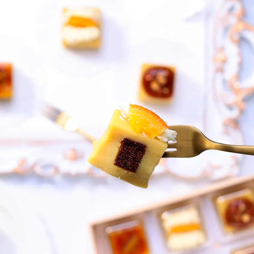 しっとり生スイートポテトの上にオレンジピール入りのクリームとドライオレンジをあしらいました。さつまいも生地の中に入っているほろ苦いブラウニーとオレンジクリームがスイートポテトと好相性の一品です。