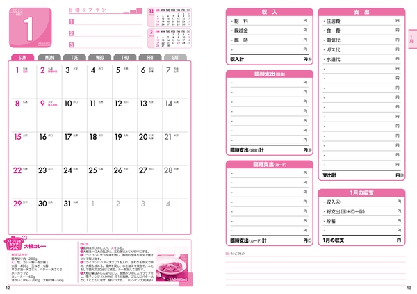 日記帳感覚で自由かつ簡単に記入できる、ロングセラー家計簿。巻頭カラーのレシピをはじめ、暮らしに役立つ生活コラムも満載。日記や毎月のまとめにも使えるメモ欄も増えて、より使いやすくなりました。領収書やレシート保存に便利なポケットつき!