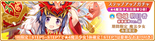本ガチャより、新魔法少女「竜城明日香 新春龍神ver.(CV:瀬戸麻沙美)」と新メモリア「小槌の輝くとき」「運試しだって全力で」が期間限定で登場いたしました。