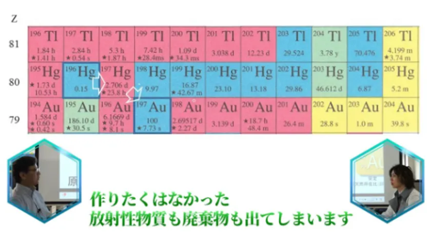 ・変換プロセス:196Hgに中性子を照射 → 197Hgを生成 → 自然崩壊により197Au(安定な金)に変換