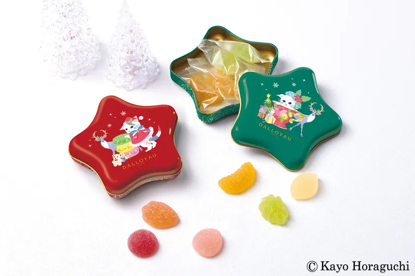 星形の缶にカラフルなフルーツゼリーを詰め合わせたクリスマス限定ギフトです。ホラグチカヨさん描き下ろしのジョセフィーニャをデザイン。食べ終わった後もインテリアや小物入れとして長く楽しめます。