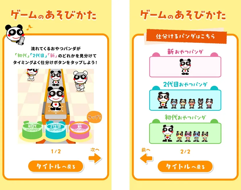 ルールはとてもシンプル。流れてくるおやつパンダに合わせて「初代」「2代目」「新」の仕分けボタンをタップするだけ。
