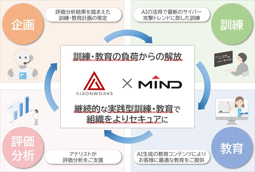 MINDは、AironWorks株式会社(以下、AironWorks)とパートナー契約を締結し、AironWorksのプラットフォームを活用した「標的型攻撃対策訓練・教育サービス」を提供します。本サービスでは、年間を通じて「企画、訓練、教育、評価分析」のサイクルを継続して実施することをご支援し、お客様のセキュリティリテラシーを向上させ、よりセキュアな組織作りに貢献します。