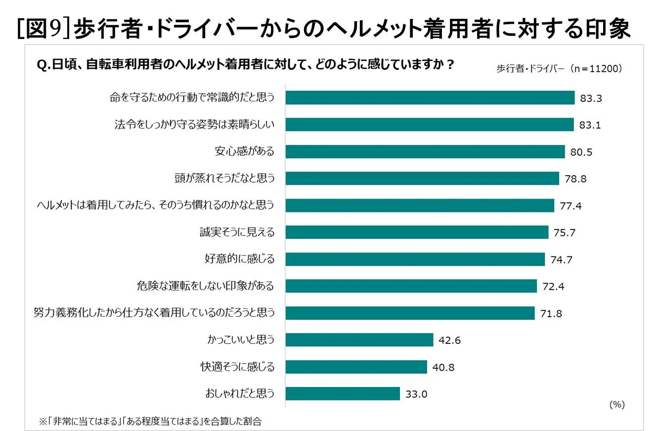 また、ヘルメット着用者に対してどのように感じるかを調べると、「命を守るための行動で常識的だと思う」(83.3%)、「法令をしっかり守る姿勢は素晴らしい」(83.1%)、「安心感がある」(80.5%)となりました。また、「誠実そうに見える」(75.7%)や「好意的に感じる」(74.7%)という回答もあり、世間からは、好印象を持たれていることが分かります。さらに、「かっこいいと思う」(42.6%)、「快適そうに感じる」(40.8%)と感じる人がいることも判明しました[図9]。