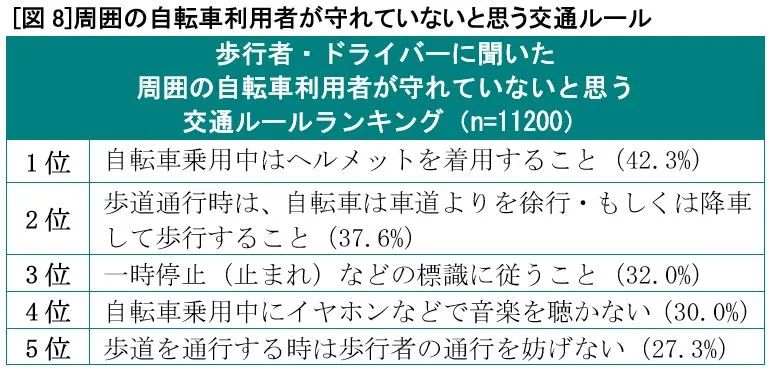 歩行者・ドライバーを対象に、自転車利用者の守れていないと思う交通ルール1位は「自転車乗用中はヘルメットを着用すること」で42.3%、2位は「歩道通行時は、自転車は車道よりを徐行・もしくは降車して歩行すること」(37.6%)、3位は「一時停止(止まれ)などの標識に従うこと」(32.0%)でした[図8]。