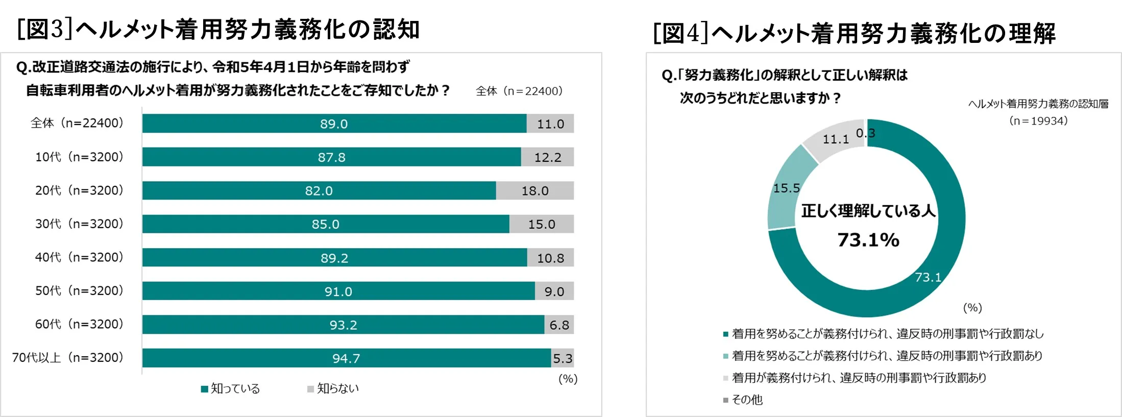 また、理解度を調べるため、法令の解釈に関する選択肢のうち正しい解釈を選ぶ質問をしたところ、正しい解釈である「着用を努めることが義務付けられ、違反時の刑事罰や行政罰なし」と回答した人は73.1%となりました[図4]。