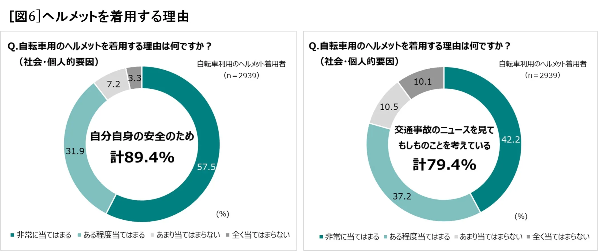 自転車乗用中にヘルメットを着用する人を対象に、その理由を聞くと、「自分自身の安全のため」(89.4%)、「交通事故のニュースを見てもしものことを考えている」(79.4%)などが主な回答でした[図6]。
