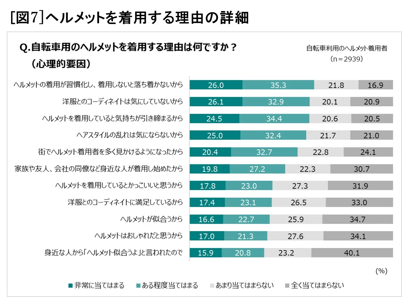 また、心理面から理由を探ったところ、61.3%が「ヘルメット着用が習慣化し、着用しないと落ち着かないから」と回答。ヘルメット着用者は、見た目よりも、着用しないリスクを理解し、着用が習慣化されている傾向がみられました[図7]。