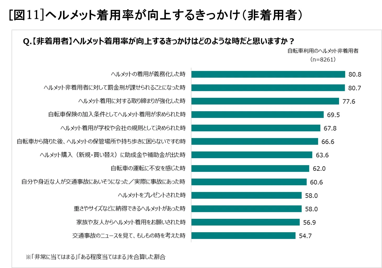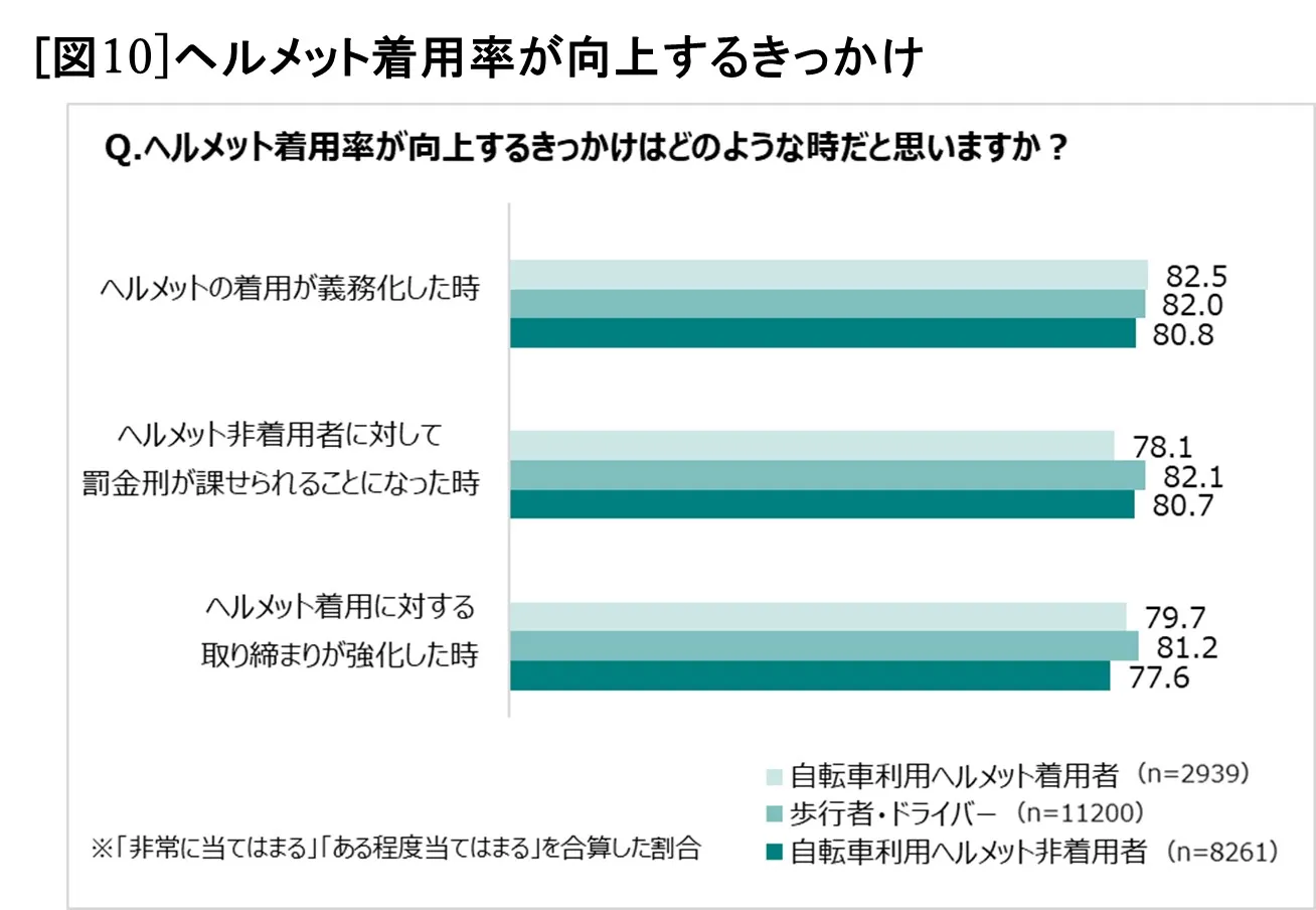 ヘルメット着用率が向上するきっかけはどのような時かを聞くと、ヘルメット着用者、非着用者、自転車に乗らない歩行者・ドライバーの3つのグループとも共通して、「ヘルメットの着用が義務化した時」(着用者82.5%、歩行者・ドライバー82.0%、非着用者80.8%)や、「ヘルメット非着用者に対して罰金刑が課せられることになった時」(78.1%、82.1%、80.7%)、「ヘルメット着用に対する取り締まりが強化した時」(79.7%、81.2%、77.6%)など、法的環境による回答に票が集まりました[図10]。