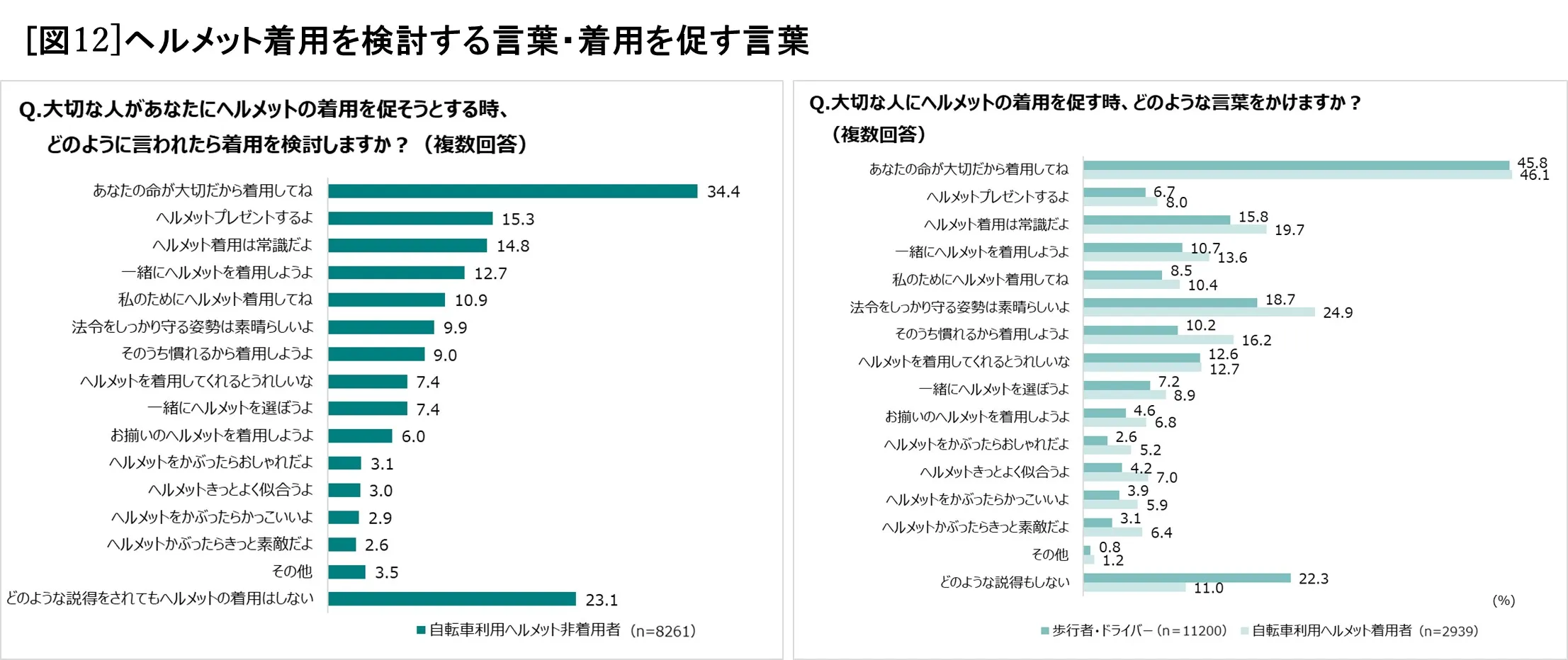 ヘルメット非着用者に対し、「大切な人があなたにヘルメット着用を促そうとする時、どのように言われたら着用を検討しますか?」と質問。また、ヘルメット着用者・歩行者・ドライバーに対しては「大切な人にヘルメットの着用を促す時、どのような言葉をかけますか?」と質問したところ、最も多かった答えは、いずれのグループも共通して「あなたの命が大切だから着用してね」(非着用者34.4%、着用者46.1%、歩行者・ドライバー45.8%)でした[図12]。