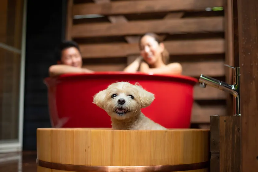 ワンちゃんと一緒に温泉&露天風呂が楽しめる宿泊プランが登場。プラン特典として「ワンちゃんお風呂エステセット」(オリジナルシャンプー・コンディショナー・クレイパック)の特典付き!