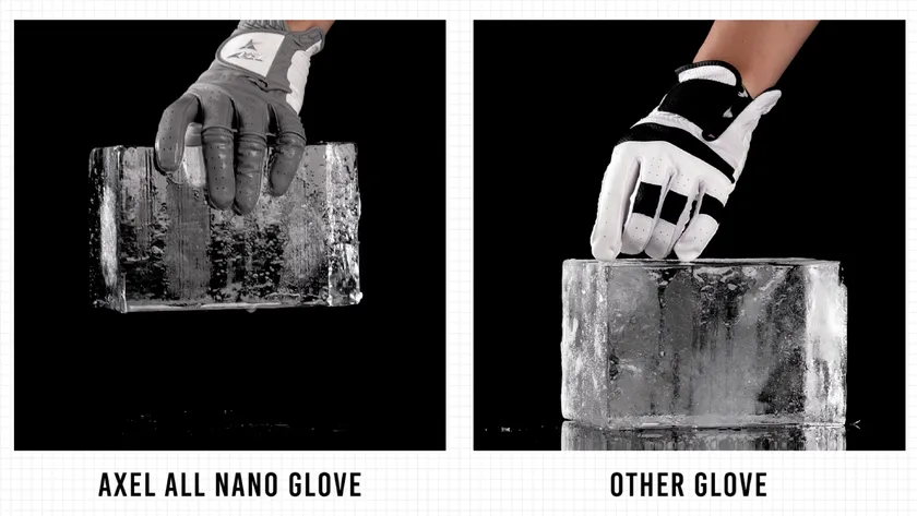 「NANO GLOVE」は脅威のグリップ力をもつグローブです。濡れた氷をつかむ実験をしたところ、通常グローブはすぐにすべって氷がつかめないのに対して、「NANO GLOVE」は濡れた氷もしっかりつかむことができ、違いは一目瞭然です。