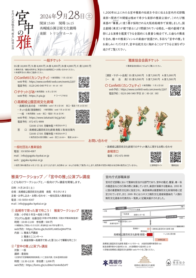 公益財団法人高槻市文化スポーツ振興事業団主催、『宮中の雅~宮内庁式部職楽部「雅楽」特別公演がににて開催されます。