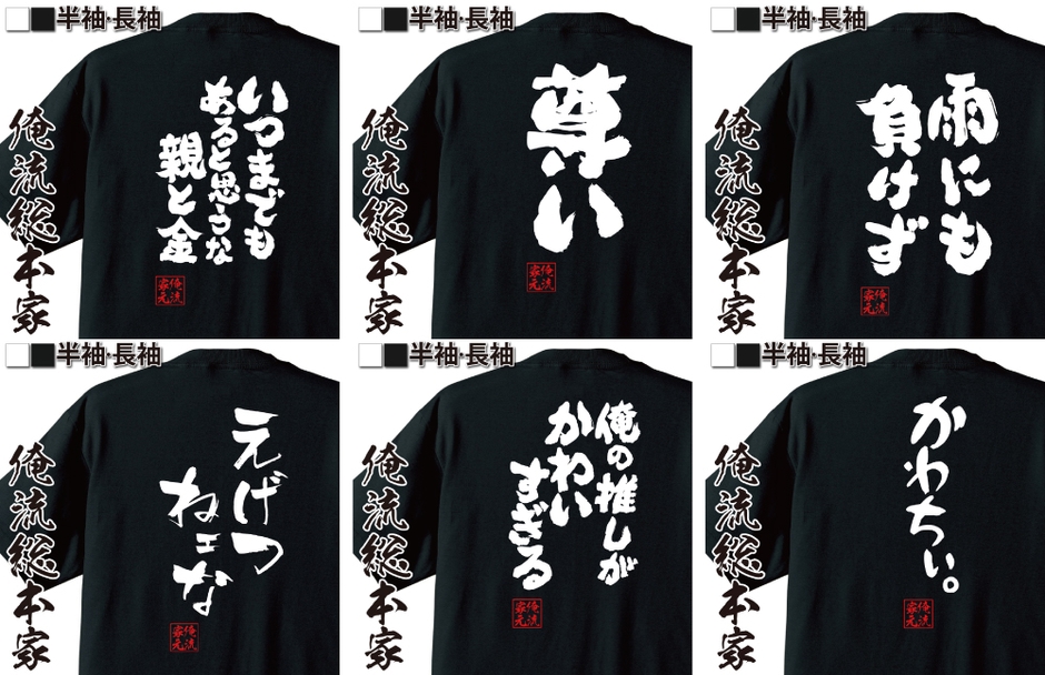俺流総本家の語録Tシャツは、1万種類以上のデザインを取り揃えています。面白いものから感動的なものまで、多彩なデザインがあり、お客様一人ひとりの個性を引き立てる一枚を見つけることができます。カスタマイズ可能なデザインもあり、特別なイベントやギフトにも最適です。