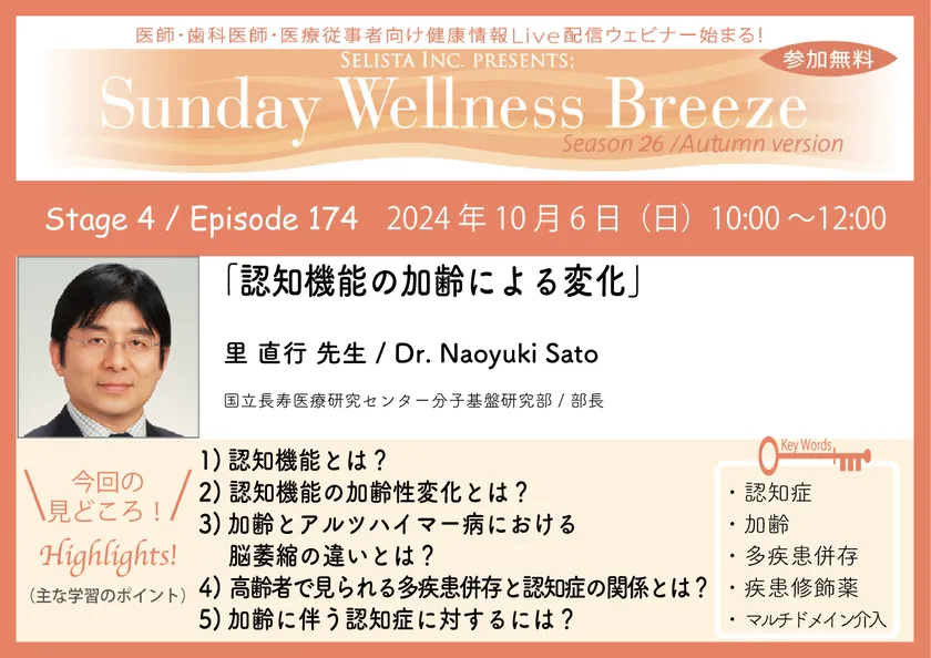 《医師・歯科医師・薬剤師向け》 無料オンラインセミナー10/6(日)朝10時開催 『認知機能の加齢による変化』 講師:里 直行 先生 (国立長寿医療研究センター分子基盤研究部/部長)