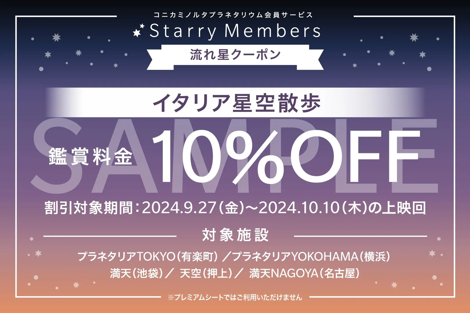 コニカミノルタプラネタリウム会員サービス「Starry Members(スターリーメンバーズ)」の会員様全員に、全館で上映中の「イタリア星空散歩」を10%OFFでご鑑賞いただけるクーポンを発行します。