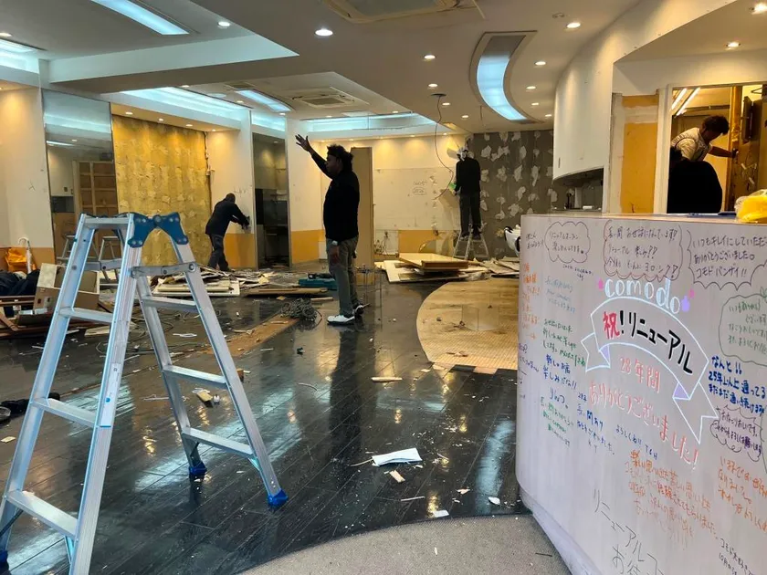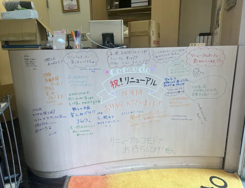 解体が始まる直前のComodoの店内には、長年ご愛顧いただいたお客様の感謝と応援のメッセージが、受付カウンターを温かく彩っていました。