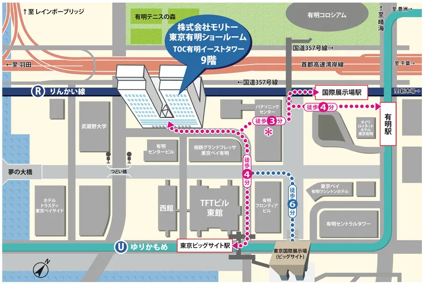 移転先の東京都江東区有明は、首都高速のジャンクションにも近く、鉄道でのアクセスも便利な場所に位置しており、首都圏のみならず、周辺地域からでも来訪いただきやすくなっております。