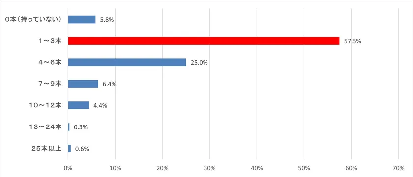 (2) カセットボンベの所持数に関しては、「1~3本」が高く57.5%(昨年は63.6%)という数値に。昨年の同調査と比較して6.1%の改善が見られたものの、政府推奨の「1人1日1本弱程度」にはまだ及ばない実態が明らかになった。