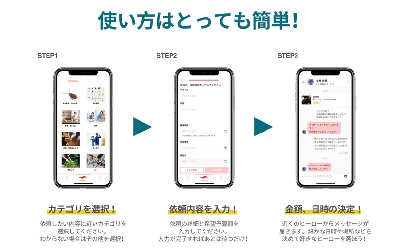 日常生活での小さなお困りごとから大きなお困りごとまで、手軽にヒーロー(便利屋さんや業務委託者)の助けを借りて解決することで、ユーザーの生活をより快適にすることを目指しています。