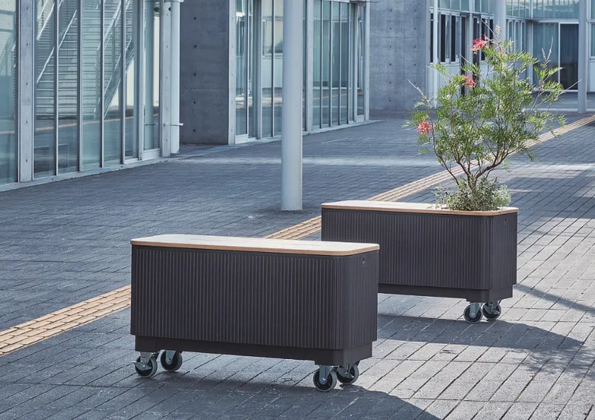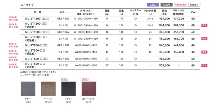 カラーは4色展開、グレー(標準色)・ベージュ(標準色)・ブラック(受注色)・カッパーレッド(受注色)、オプションにてキャスター、アジャスター、転倒防止バー、座部を取り付け可能。空間を演出には欠かせない、デザインと機能を兼ね備えた新プランター。