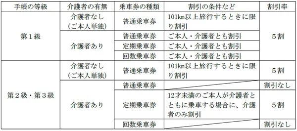 ・ご本人・介護者とも割引を受けることができるのは、同一の種類・乗車区間・有効期間の乗車券を同時にお買い求めいただき、同一の列車に乗車する場合に限ります。