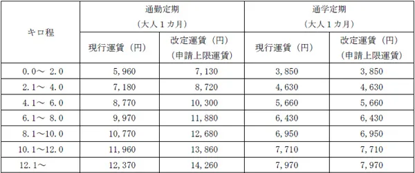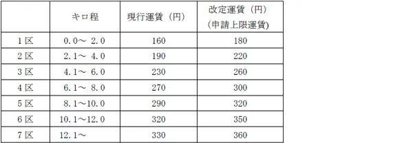 普通旅客運賃のうち、初乗り運賃(キロ程2.0km以下)は20円、その他の区間(キロ程2.1km以上)の運賃については30円ずつ、それぞれ引き上げます。