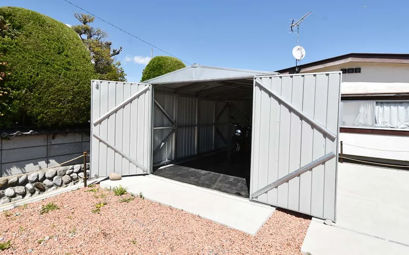 柱が内部にあるため、柱を利用して棚のDIYができさらに使いやすい物置に。